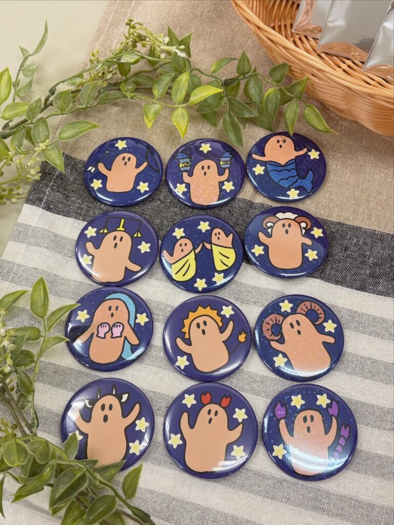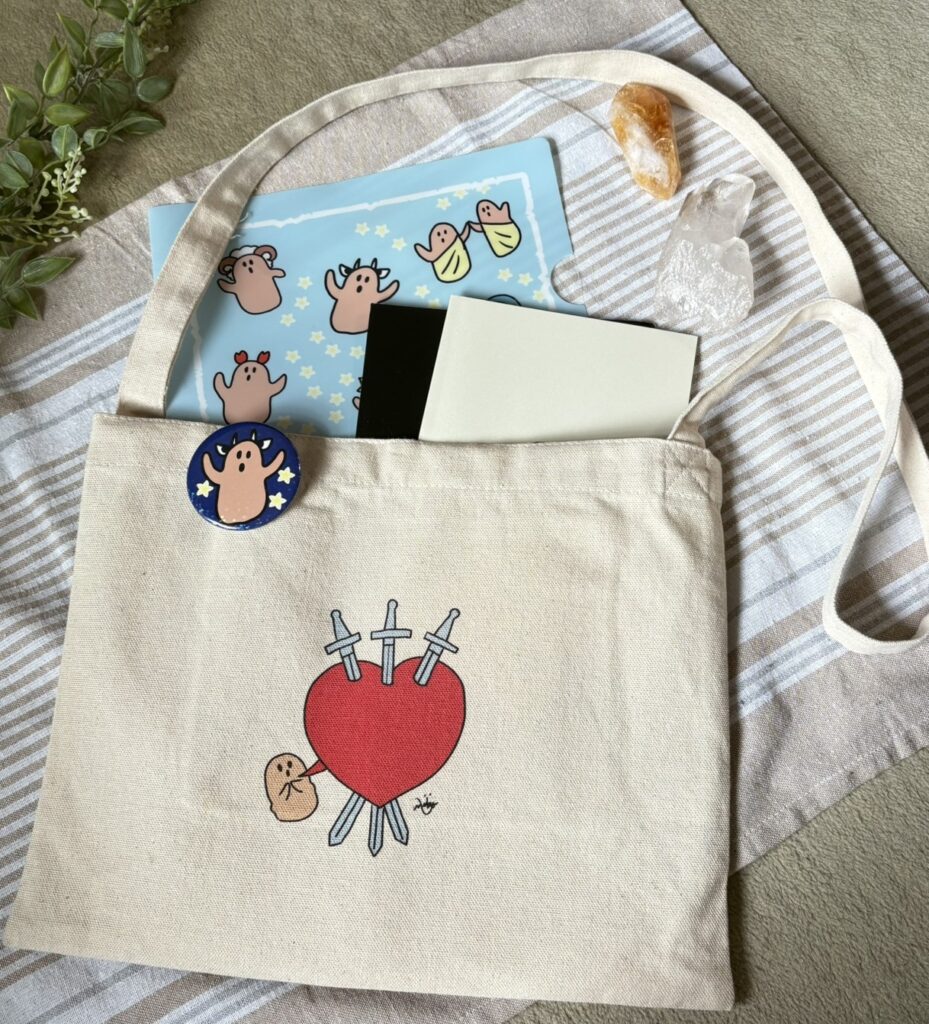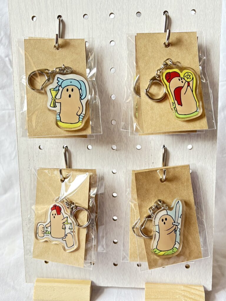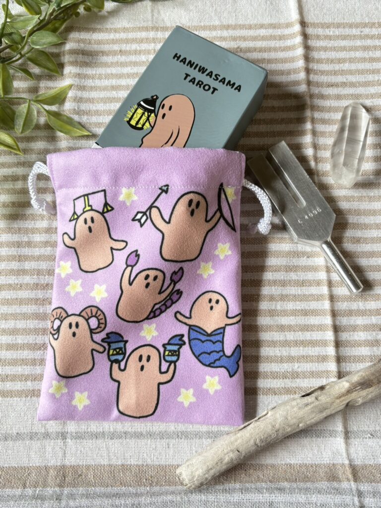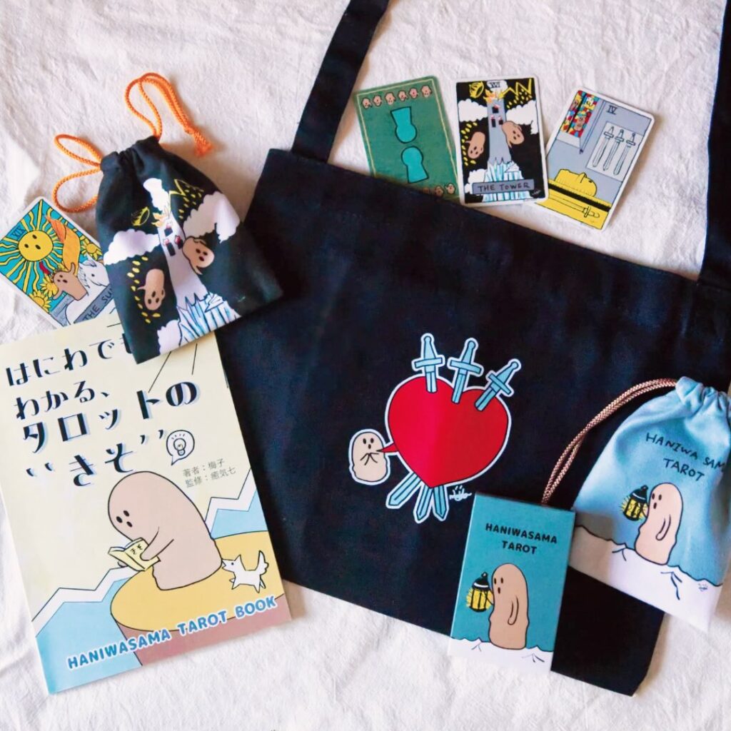 タロットカードや、サコッシュ、巾着、缶バッチなど、
